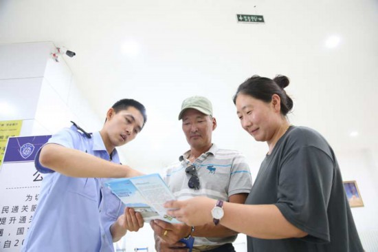 在滿都拉口岸,包頭出入境邊防檢查站執(zhí)勤業(yè)務(wù)科副科長(zhǎng)宋強(qiáng)每天24小時(shí)帶著對(duì)講機(jī)。執(zhí)勤時(shí),他的代號(hào)是“04”。