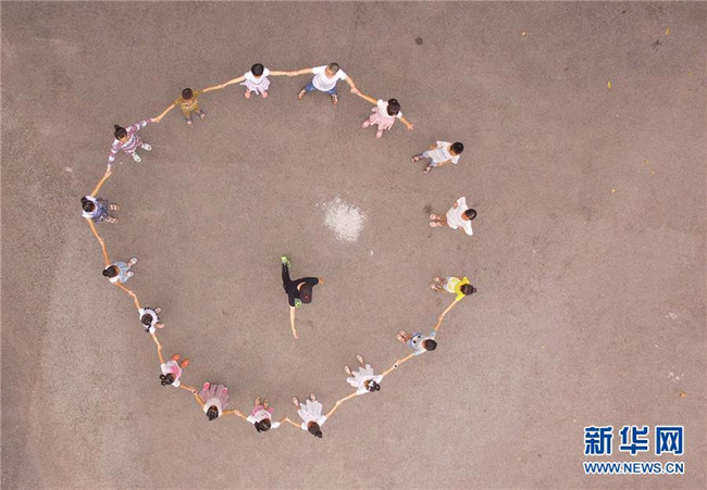 8月5日,參加音樂(lè)培訓(xùn)班的小朋友們和老師一起在課間做游戲(無(wú)人機(jī)拍攝)。 新華社記者 王全超 攝