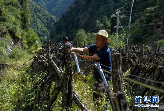 8月10日,四川壤塘縣下大石溝村黨支部書記索更(右一)帶領(lǐng)村民為村集體的青杠木耳種植示范基地更換噴淋水管。新華社記者 張超群 攝.