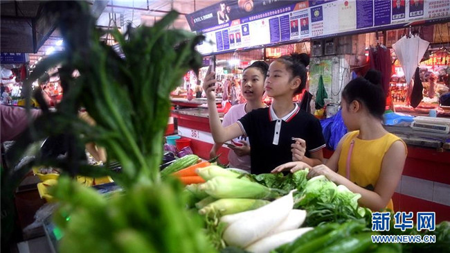8月6日,芭蕾小天使們在市場上買菜,幫助父母分擔(dān)家務(wù)活(視頻截圖)。新華社記者 張愛林 攝