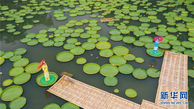 巨大的王蓮葉片如同一個(gè)個(gè)綠色的大玉盤(pán),錯(cuò)落有致地鋪滿整個(gè)水塘。新華網(wǎng)發(fā)(張嬌嬌 攝)