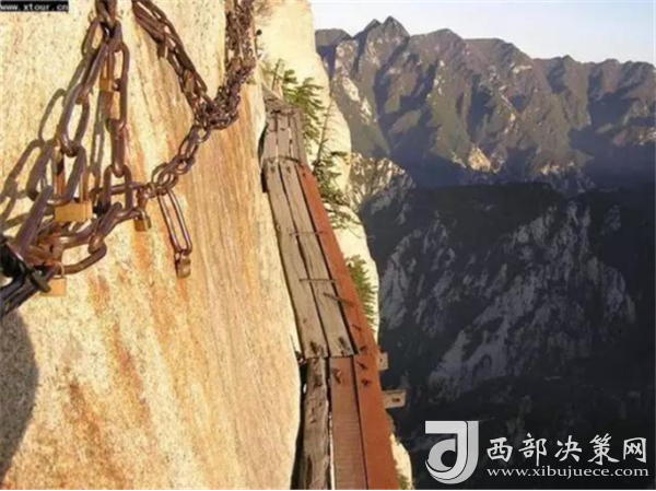 在從南峰到東峰的山路上還有兩處景點(diǎn):一是"避詔崖",著名道士陳摶,為躲避皇帝征召曾避居此處的山洞中;另一處是絕壁千丈而不見(jiàn)底的長(zhǎng)空棧道,棧道依懸崖開(kāi)鑿,游人需手扶鐵索木欄而過(guò),是華山上又一險(xiǎn)處。