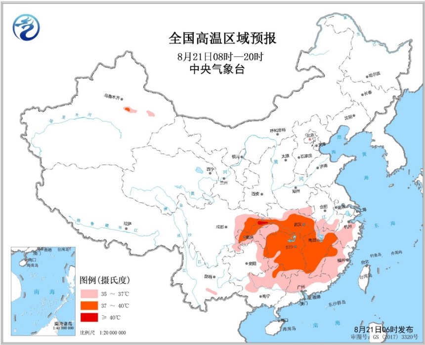 未來三天,西南地區(qū)東部、江漢、江南、華南中北部等地將有高溫天氣。中央氣象臺8月21日06時繼續(xù)發(fā)布高溫黃色預(yù)警。預(yù)計8月21日白天,江漢大部、江南大部、四川盆地東部、重慶、貴州東部、華南中北部等地最高氣溫35~36℃,其中,湖北中南部、湖南大部、江西大部、四川東北部、重慶大部、廣西東北部等地的部分地區(qū)最高氣溫37~39℃,重慶北部局地可達(dá)40℃以上。