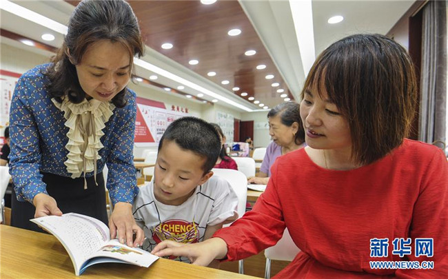 老師(前左)和家長(前右)一起在永清縣城區(qū)街道公益書屋指導孩子誦讀(8月20日攝)。新華社記者 李曉果 攝