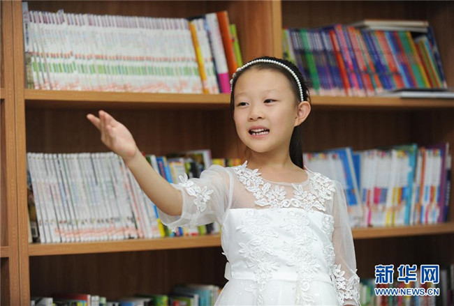 一名孩子在永清縣城區(qū)街道公益書屋內誦讀經典詩文(8月20日攝)。新華社記者 李曉果 攝