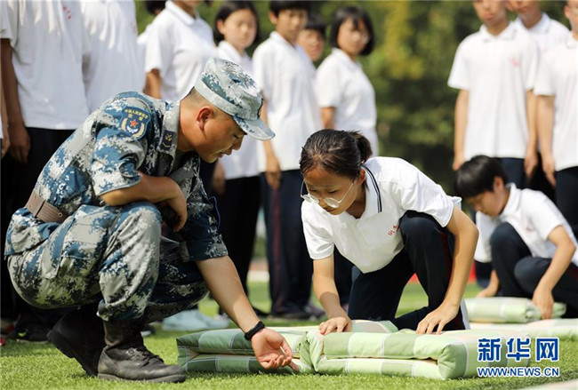 8月27日,河北省衡水市第二中學(xué)高一新生在教官指導(dǎo)下練習(xí)整理內(nèi)務(wù)。新華社記者朱旭東攝