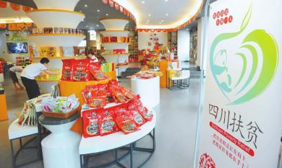 在四川特產(chǎn)購物中心內(nèi)售賣的貼有“四川扶貧”公益性集體商標(biāo)的產(chǎn)品。四川日?qǐng)?bào)記者何海洋攝