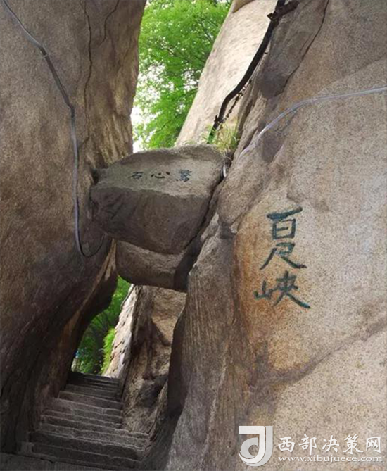 出千尺㠉不遠(yuǎn)是百尺峽,這里是登山第二道險關(guān)。兩壁高聳,中間夾有一塊從天而降的巨石,上刻“驚心石”三個大字,游人要從石下小路穿過,確實驚心動魄。此后還有仙人橋、俯渭崖、黑虎嶺等小險處,就到了登山第三道險關(guān)老君犁溝,這是夾在陡峭石壁之間的一條溝狀險道,深不可測,有石階570有余。