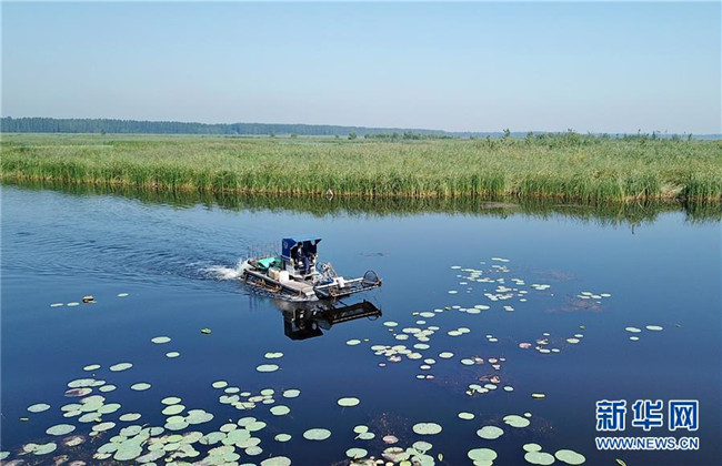 一艘打撈船在白洋淀景區(qū)內(nèi)清理漂浮物(8月31日無人機拍攝)。新華社記者 牟宇 攝
