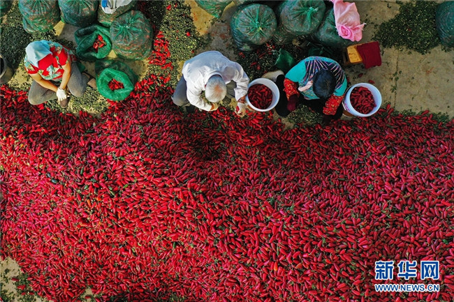 這是近日在甘肅省高臺縣拍攝的辣椒分揀、挑選場景。時下,高臺縣宣化鎮(zhèn)和駱駝城鎮(zhèn)種植的1700畝墨西哥辣椒進入采摘和收購期,火紅的辣椒堆積如山,映紅了農(nóng)民的笑臉。新華網(wǎng)發(fā)(鄭耀德 攝)