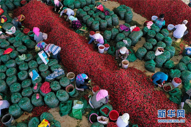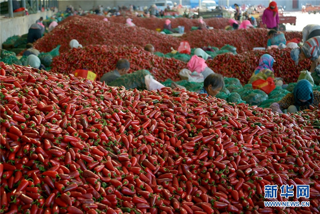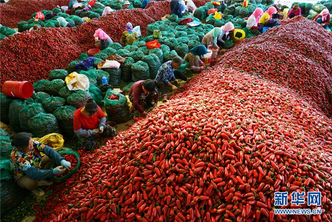甘肅高臺千畝辣椒獲豐收 堆積如山紅似火