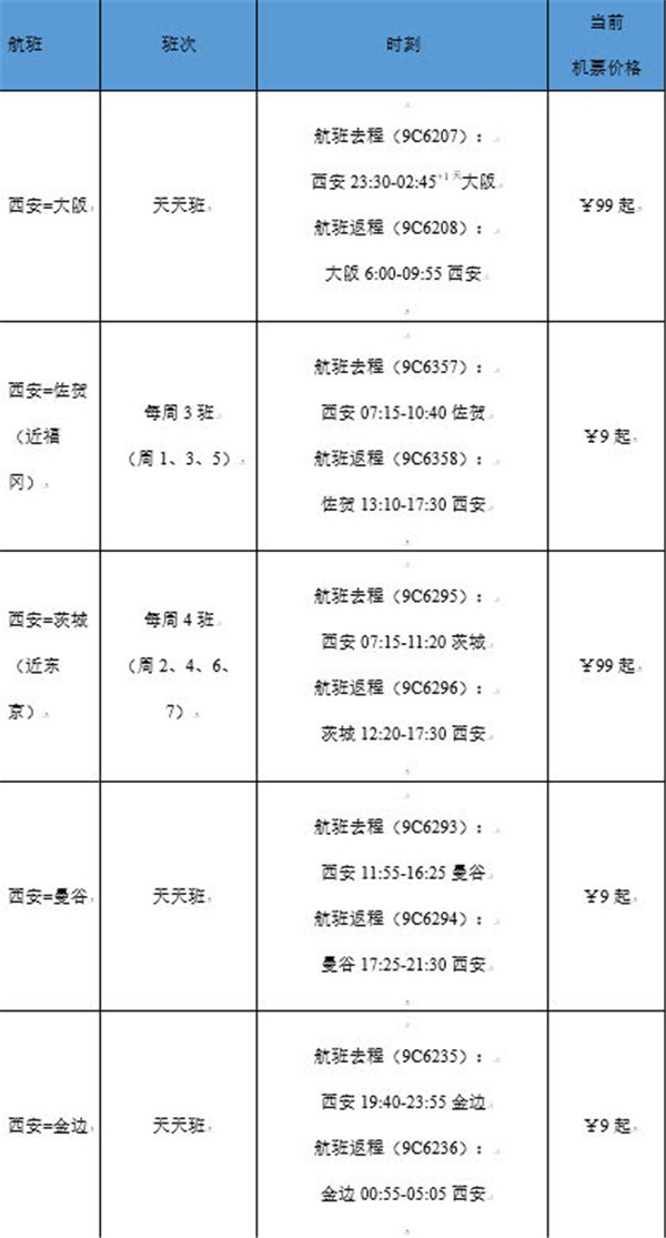 據了解,此次新開的航線及加密航線,將從2019年10月27日起陸續(xù)開始執(zhí)行,執(zhí)飛機型為空客A320。開航初期,機票價格相對優(yōu)惠,從春秋航空官網查詢到的價格來看,西安飛大阪、茨城(近東京)99元起(不含稅),西安飛佐賀(近福岡)、曼谷、金邊低至9元起(不含稅)。
