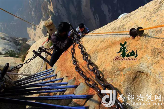 長空棧道位于華山南峰東側(cè)山腰,是華山派第一代宗師元代高道賀志真為遠(yuǎn)離塵世靜修成仙,在萬仞絕壁上鑲嵌石釘搭木椽而筑。棧道上下皆是懸崖絕壁,鐵索橫懸,由條石搭成尺許路面,下由石柱固定,游人至此,面壁貼腹,屏氣挪步,被譽(yù)為“華山第一天險(xiǎn)”。由于棧道險(xiǎn)峻,故當(dāng)?shù)厝擞?ldquo;小心九厘三分,要尋尸首,洛南商州”之說。這里只是探險(xiǎn)之道,并非登山必由之路,膽小人就在升表臺看看也就行了。所以石刻上不少警告之語:“懸崖勒馬”等。(供稿:華旅集團(tuán)營銷中心)