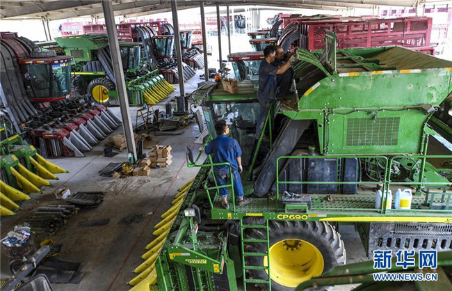 在位于新疆生產(chǎn)建設(shè)兵團(tuán)第六師五家渠市的新疆準(zhǔn)噶爾銀豐農(nóng)機(jī)裝備有限公司內(nèi),檢修人員在檢修保養(yǎng)采棉機(jī)(7月31日攝)。 新華社記者 王菲 攝