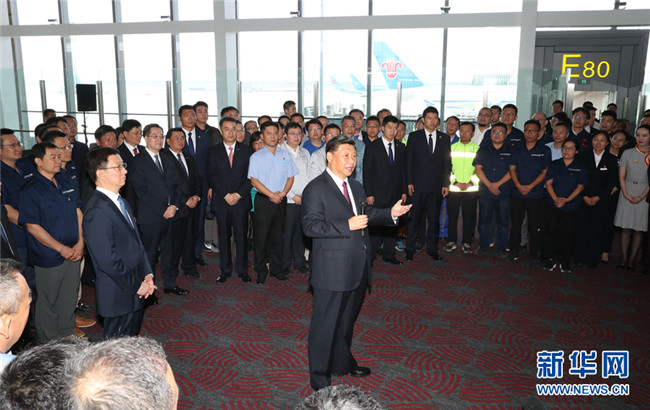 大興機(jī)場航站樓,是目前全球最大規(guī)模的單體航站樓,以其獨(dú)特的造型設(shè)計(jì)、精湛的施工工藝、便捷的交通組織、先進(jìn)的技術(shù)應(yīng)用,創(chuàng)造了許多世界之最。航站樓里,流線型的空間結(jié)構(gòu)十分寬敞明亮。習(xí)近平步行巡覽站臺(tái)大廳和值機(jī)大廳,實(shí)地了解值機(jī)、安檢、登機(jī)和殘疾人無障礙設(shè)施等情況,并結(jié)合沙盤和模型聽取機(jī)場總體規(guī)劃、設(shè)施建設(shè)等介紹。習(xí)近平強(qiáng)調(diào),大興國際機(jī)場是首都的重大標(biāo)志性工程,是推動(dòng)京津冀協(xié)同發(fā)展的骨干工程。京津冀三地要抓住機(jī)遇加強(qiáng)協(xié)同合作,加快推動(dòng)地區(qū)高質(zhì)量發(fā)展。民航業(yè)是國家重要的戰(zhàn)略產(chǎn)業(yè)。要建設(shè)更多更先進(jìn)的航空樞紐、更完善的綜合交通運(yùn)輸系統(tǒng),加快建設(shè)交通強(qiáng)國。
