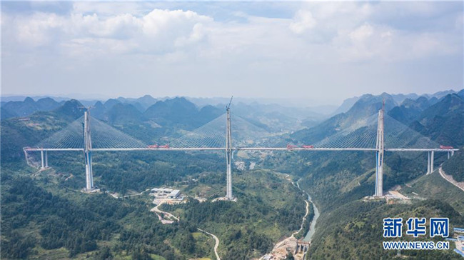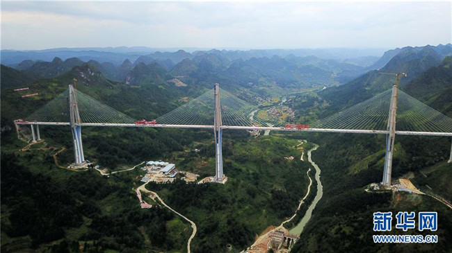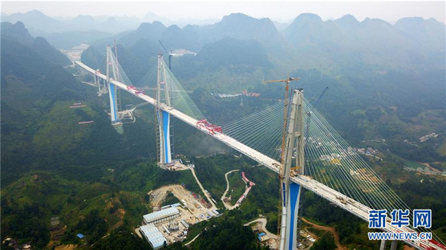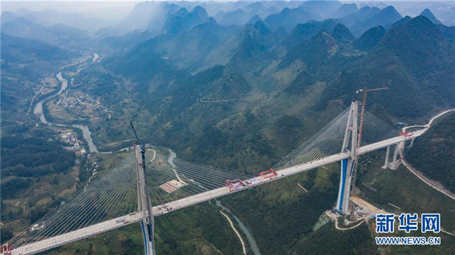 當(dāng)日,332米高的全球最高混凝土橋塔——貴州平塘至羅甸高速公路控制性工程平塘特大橋成功合龍。記者從貴州省交通運(yùn)輸廳了解到,平塘特大橋全長(zhǎng)2135米,橋面寬30.2米,規(guī)劃雙向4車道,是一座三塔雙索面疊合梁斜拉橋。三座橋塔的高度分別為320米、332米和298米,相當(dāng)于在峽谷之中建了三座100多層高的大樓。平塘特大橋于2016年4月開工建設(shè),2018年11月橋塔順利封頂,計(jì)劃總工期為42個(gè)月,總投資15億元。此次合龍后,還要進(jìn)行橋面施工和欄桿等工程建設(shè),預(yù)計(jì)今年底全橋通車,屆時(shí)平塘到羅甸的通行時(shí)間將從2個(gè)半小時(shí)縮短至1小時(shí),將成為連接貴州南部的交通要道,對(duì)助推滇黔桂石漠化片區(qū)脫貧攻堅(jiān)具有重要意義。新華社記者楊文斌攝