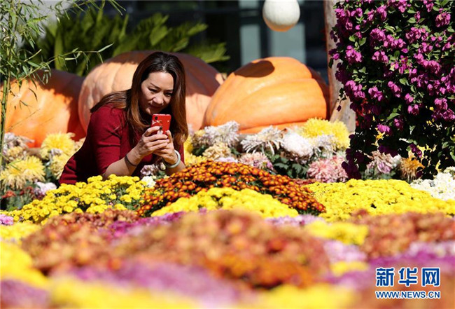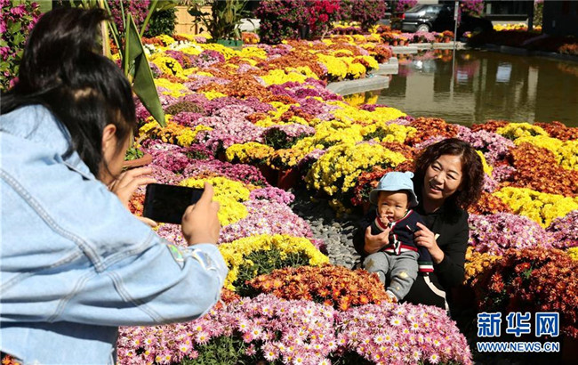 10月8日,在大廠回族自治縣小廠村,游客在菊花展上拍照留念。新華社記者 王曉 攝
