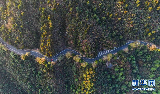 車輛行駛在通往廬山風(fēng)景區(qū)的北山公路上(10月9日無人機(jī)拍攝)。新華社記者 胡晨歡 攝