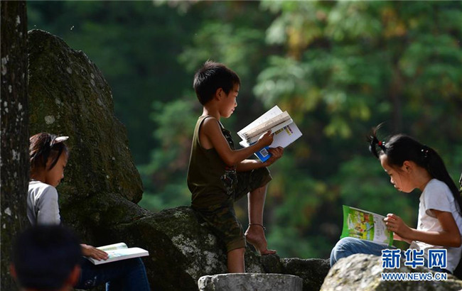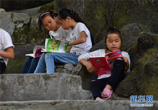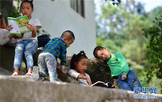 黔桂烏英苗寨的孩子們?cè)陂喿x剛剛獲贈(zèng)的圖書(10月11日攝)。新華社記者 黃孝邦 攝