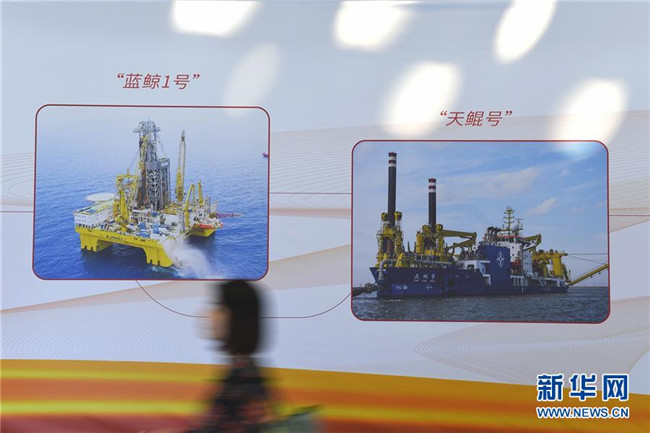 10月15日,與會者經(jīng)過“藍(lán)鯨1號”鉆井平臺與“天鯤號”自航絞吸挖泥船展板。 新華社記者毛思倩攝