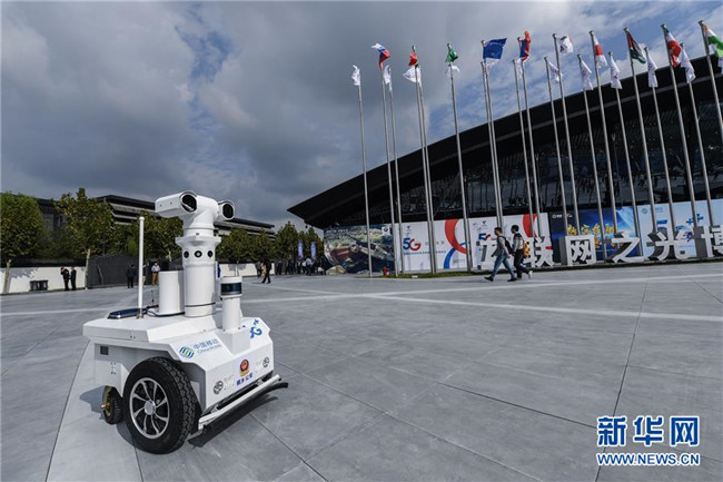 這是互聯(lián)網之光博覽會場館外巡邏的5G警用機器人(10月18日攝)。 新華社記者 徐昱 攝