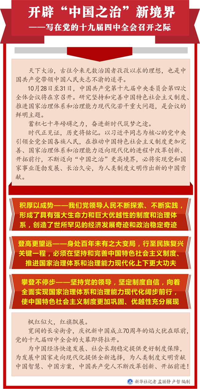 10月28日至31日,中國共產(chǎn)黨第十九屆中央委員會第四次全體會議將在京召開。研究堅持和完善中國特色社會主義制度、推進(jìn)國家治理體系和治理能力現(xiàn)代化若干重大問題,是會議的鮮明主題。