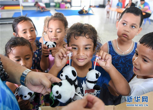 10月26日,在庫(kù)克群島首都阿瓦魯阿的阿皮尼考學(xué)校,幼兒園的孩子手拿來(lái)自中國(guó)的熊貓掛件。