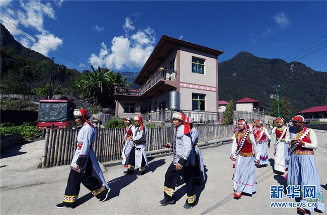 11月2日,云南福貢縣鹿馬登鄉(xiāng)干布村的傈僳族群眾行走在水泥硬化路上。新華社記者 楊宗友 攝
