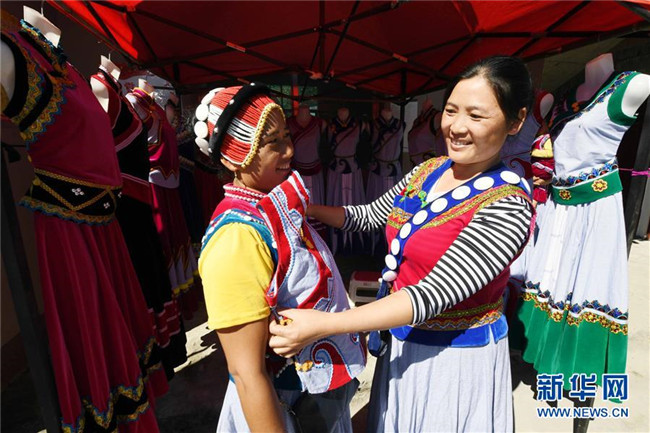 11月2日,云南福貢縣鹿馬登鄉(xiāng)干布村的傈僳族婦女阿白(右)在展示自己手工制作的服飾。阿白靠傳統(tǒng)服飾制作每年可收入三萬(wàn)多元。新華社記者 楊宗友 攝