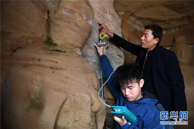 11月5日,在甘肅省慶陽市北石窟寺267窟,敦煌研究院北石窟寺文物保護研究所工作人員在檢測記錄巖體含水率。 新華社記者 馬寧 攝