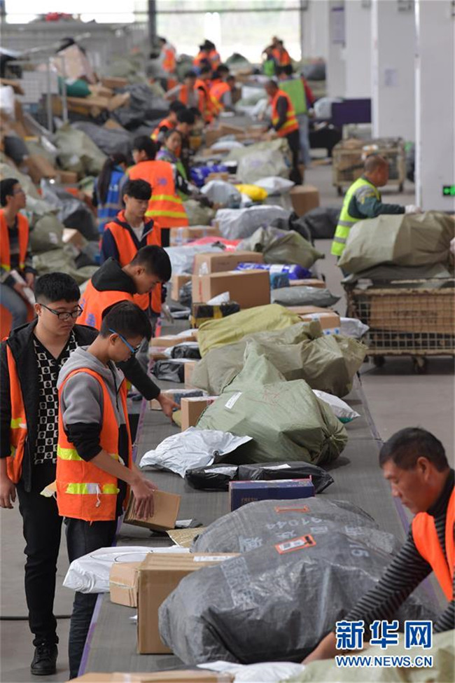 在圓通速遞公司南昌轉(zhuǎn)運(yùn)中心,工作人員正在流水線(xiàn)上分揀快遞包裹(2018年11月14日攝)。新華社記者 彭昭之 攝