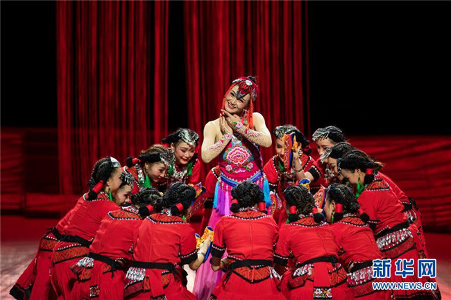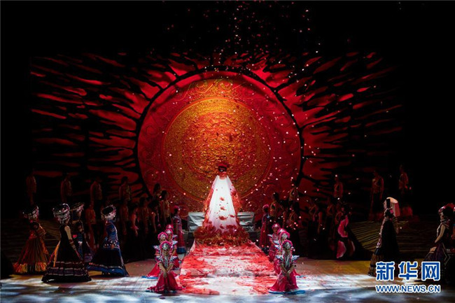 演員在音樂舞劇《云繡彝裳》第四章節(jié)“紅妝似火”中表演(11月15日攝)。新華社記者胡超攝