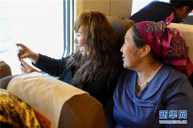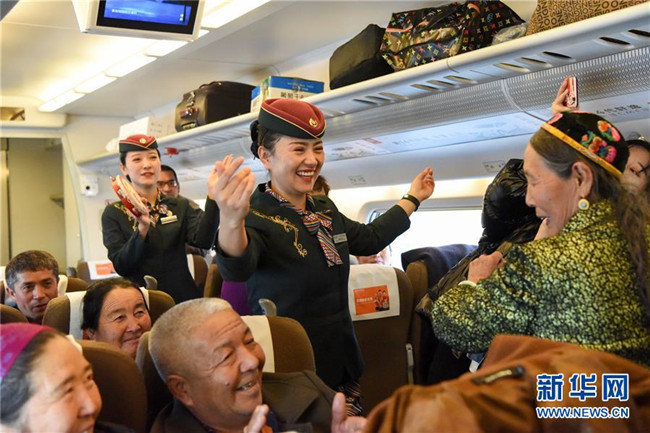 11月16日,在D8804次動(dòng)車組列車上,乘務(wù)員和乘客跳起舞慶祝蘭新高鐵新疆段開通運(yùn)營五周年。新華社記者 丁磊 攝