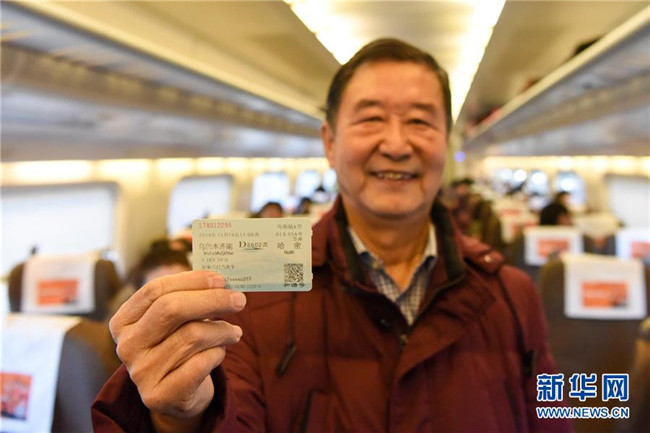11月16日,在D8804次動(dòng)車組列車上,乘客張長齡展示2014年11月16日蘭新高鐵新疆段開通的首趟列車車票。新華社記者 丁磊 攝