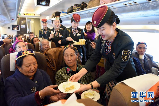 11月16日,在D8804次動(dòng)車組列車上,乘務(wù)員為乘客送上蘭新高鐵新疆段開通運(yùn)營五周年的“生日”蛋糕。新華社記者 丁磊 攝