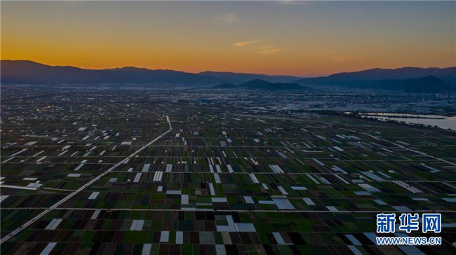 這是云南省玉溪市通??h的田園風(fēng)光(11月23日無人機(jī)拍攝)。初冬時節(jié),云南省玉溪市通海縣風(fēng)景秀麗,山巒、湖水與農(nóng)田組成了一幅美麗的田園詩畫卷。新華社記者胡超攝