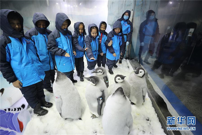 當(dāng)日,來自廣州和珠海的小學(xué)生代表來到珠海長隆海洋王國,參加企鵝關(guān)愛活動(dòng),零距離接觸今年新生的帝企鵝。本次活動(dòng)旨在加強(qiáng)極地科普教育,提高小學(xué)生保護(hù)動(dòng)物和呵護(hù)極地的意識(shí)。 新華社記者 盧燁 攝