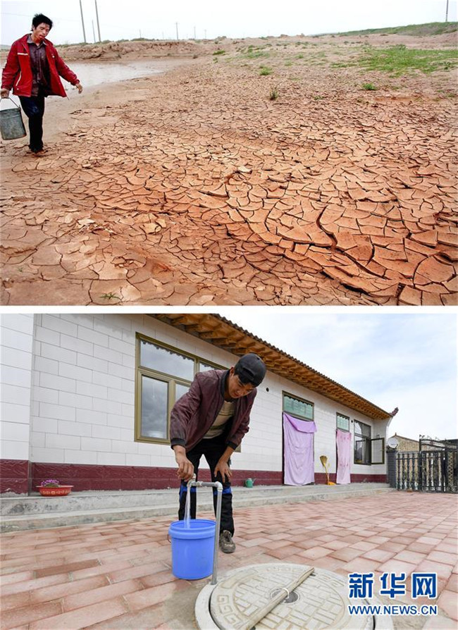 拼版照片:上圖為寧夏同心縣預(yù)旺鎮(zhèn)村民趙海江在北旺水庫(kù)取水(新華社記者李紫恒2006年8月13日攝);