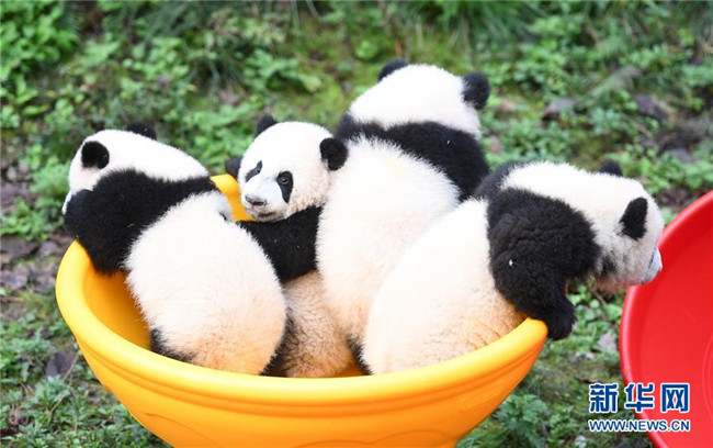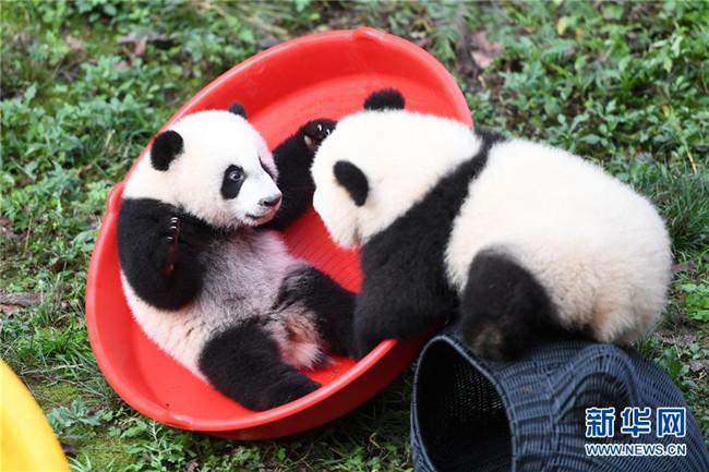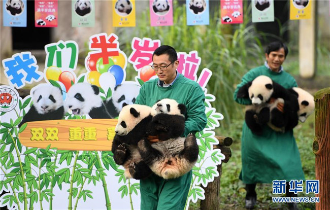 12月22日,重慶動物園4只半歲大熊貓?jiān)趹敉饣顒印.?dāng)日,重慶動物園為4只大熊貓寶寶“雙雙”“重重”“喜喜”“慶慶”舉行半歲生日慶祝活動。4只半歲大熊貓?jiān)陲曫B(yǎng)員的照料下,在熊貓館運(yùn)動場內(nèi)玩耍、嬉戲,與市民游客一同過冬至。新華社記者唐奕攝