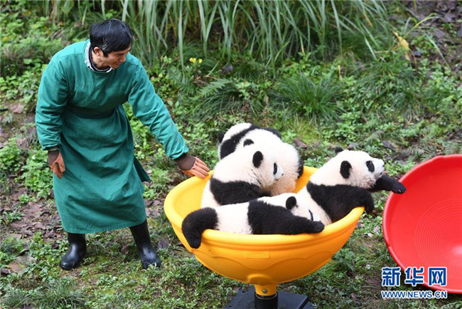 12月22日,飼養(yǎng)員引導(dǎo)大熊貓寶寶到戶外運(yùn)動。當(dāng)日,重慶動物園為4只大熊貓寶寶“雙雙”“重重”“喜喜”“慶慶”舉行半歲生日慶祝活動。4只半歲大熊貓?jiān)陲曫B(yǎng)員的照料下,在熊貓館運(yùn)動場內(nèi)玩耍、嬉戲,與市民游客一同過冬至。新華社記者唐奕攝