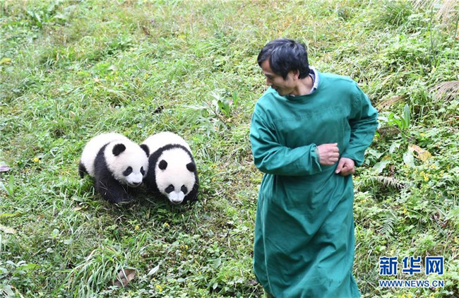 12月22日,飼養(yǎng)員引導(dǎo)大熊貓寶寶到戶外運(yùn)動。當(dāng)日,重慶動物園為4只大熊貓寶寶“雙雙”“重重”“喜喜”“慶慶”舉行半歲生日慶?;顒印?只半歲大熊貓?jiān)陲曫B(yǎng)員的照料下,在熊貓館運(yùn)動場內(nèi)玩耍、嬉戲,與市民游客一同過冬至。新華社記者唐奕攝