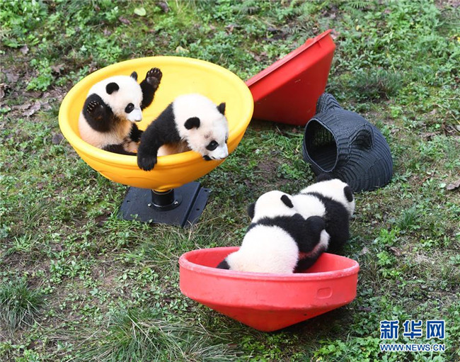 12月22日,重慶動物園4只半歲大熊貓?jiān)谕嫠?。?dāng)日,重慶動物園為4只大熊貓寶寶“雙雙”“重重”“喜喜”“慶慶”舉行半歲生日慶?;顒?。4只半歲大熊貓?jiān)陲曫B(yǎng)員的照料下,在熊貓館運(yùn)動場內(nèi)玩耍、嬉戲,與市民游客一同過冬至。新華社記者唐奕攝