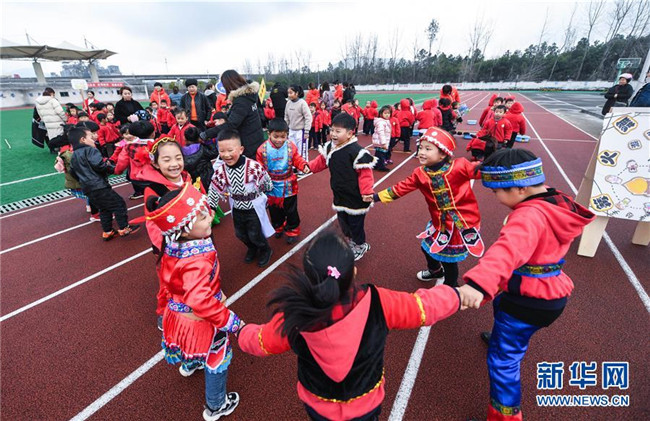 12月26日,身著少數(shù)民族服裝的孩子與同學(xué)們一起參加篝火舞活動(dòng)。當(dāng)日,浙江省長(zhǎng)興縣李家巷鎮(zhèn)中心幼兒園舉辦“炫彩民族風(fēng)歡樂(lè)來(lái)運(yùn)動(dòng)”為主題的趣味民族游戲活動(dòng)。該幼兒園有一些孩子來(lái)自壯族、苗族、布依族等少數(shù)民族。幼兒園旨在通過(guò)這種活動(dòng),讓孩子們和家長(zhǎng)共同體驗(yàn)竹竿舞、篝火舞、擲糠包等少數(shù)民族特色游戲,了解少數(shù)民族特色文化。新華社記者徐昱攝