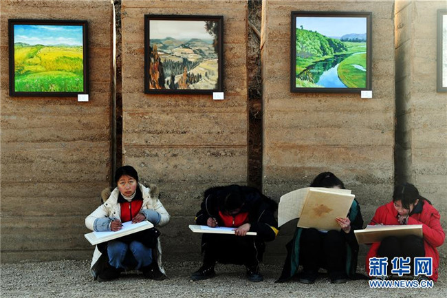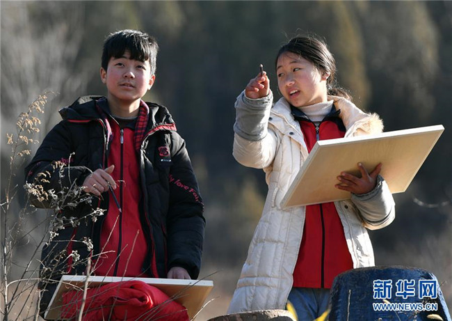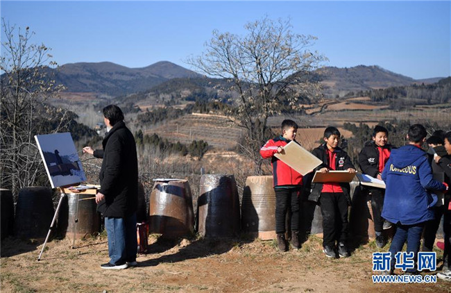 洛寧縣羅嶺鄉(xiāng)初級中學(xué)學(xué)生在洛寧縣前河村進(jìn)行繪畫創(chuàng)作(12月29日攝)。新華社記者 李嘉南 攝