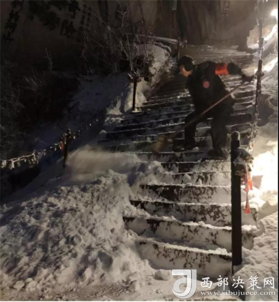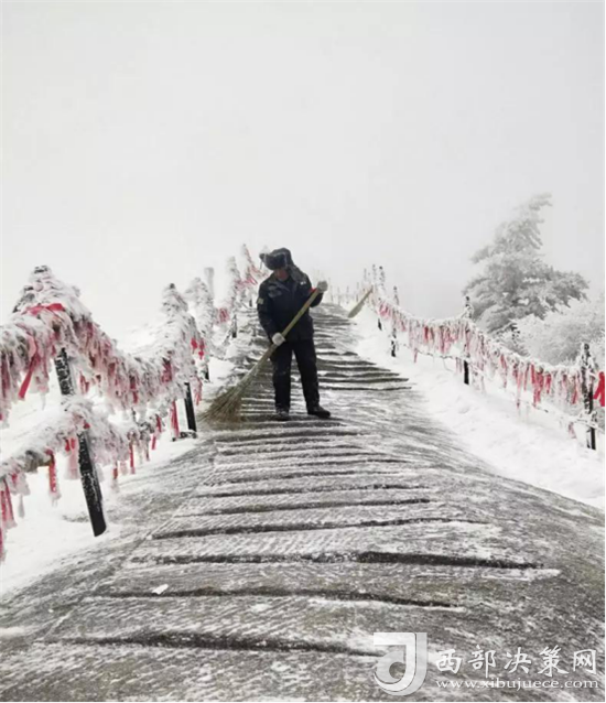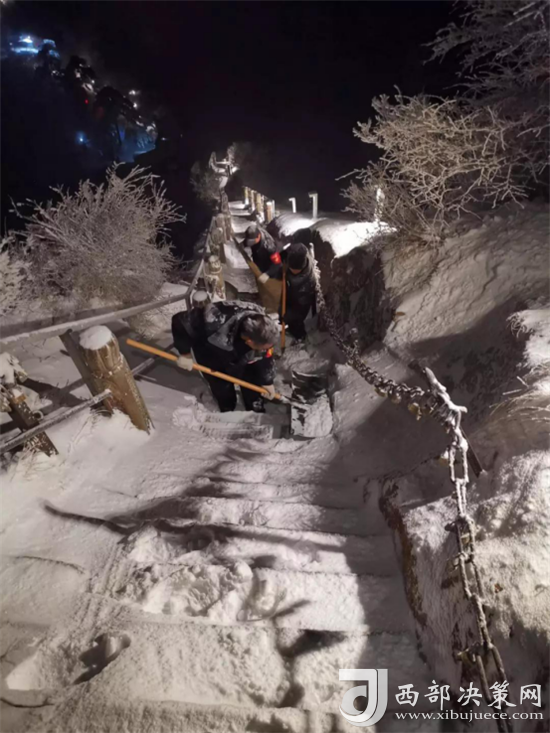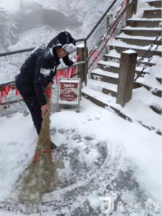清晨天亮后,工作人員以常態(tài)化的工作要求持續(xù)對道路積雪進(jìn)行細(xì)化清掃,防止路面結(jié)冰,發(fā)生安全事故。(供稿:華山景區(qū)管理公司)