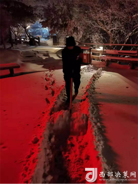 清晨天未亮?xí)r,主峰區(qū)全體人員冒著嚴(yán)寒降雪已經(jīng)投入到清掃積雪的工作中。