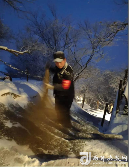 我們的工作人員不畏天寒地凍,在大雪里默默堅(jiān)守在一線,大雪浸濕了衣襟也不為所動,用自己手中的“畫筆”為游客“畫出”一條安全暢通的景觀道路,他們擾動了那一份美景,為的卻是給游客更多的安全。