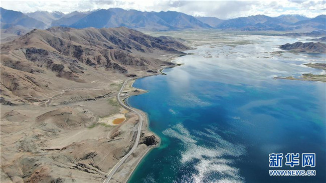2019年8月3日拍攝的位于西藏阿里地區(qū)境內(nèi)的班公湖畔的公路(無人機照片)。 新華社記者 晉美多吉 攝