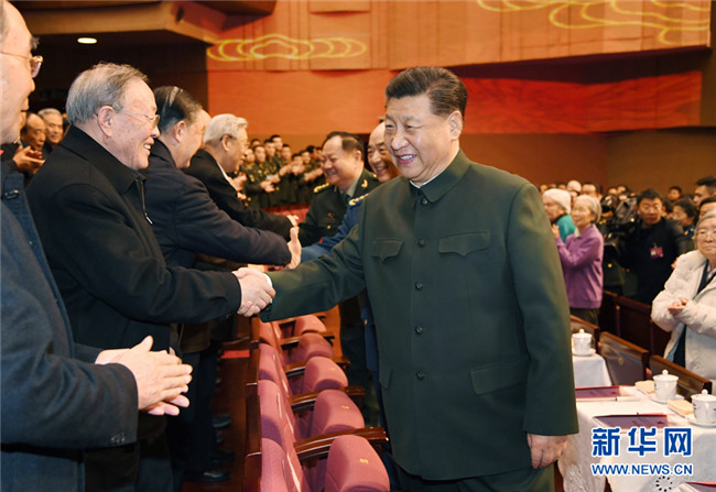 下午4時許,習近平來到老同志中間,全場響起熱烈掌聲。習近平同大家親切握手,關(guān)切詢問他們的身體和生活情況,共同回顧過去一年黨、國家、軍隊事業(yè)取得的重大成就。老同志們一致表示,要更加緊密地團結(jié)在以習近平同志為核心的黨中央周圍,以習近平新時代中國特色社會主義思想為指導(dǎo),貫徹習近平強軍思想,貫徹新時代軍事戰(zhàn)略方針,堅持政治建軍、改革強軍、科技強軍、人才強軍、依法治軍,不忘初心、牢記使命,銳意進取、開拓創(chuàng)新,為實現(xiàn)國防和軍隊建設(shè)2020年目標任務(wù),為奪取全面建成小康社會偉大勝利作出新的貢獻。