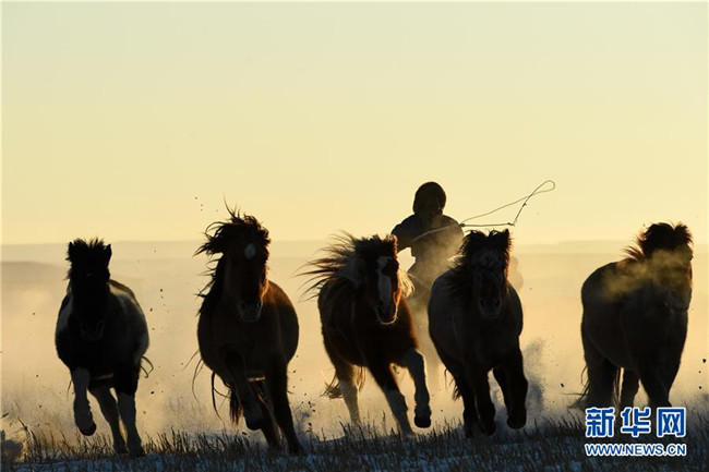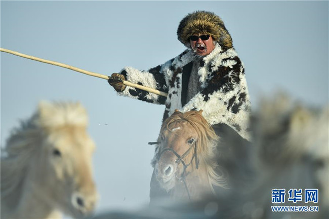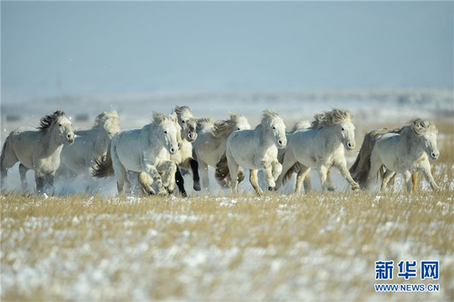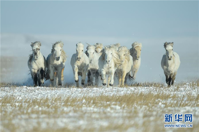 當(dāng)日,內(nèi)蒙古自治區(qū)錫林浩特市鳳凰馬場進(jìn)行了一場馴馬活動。騎手們趕著馬群,在白茫茫的草原上奔跑,景象壯觀,吸引了不少游客和攝影愛好者前來觀賞。 新華社記者 劉磊 攝